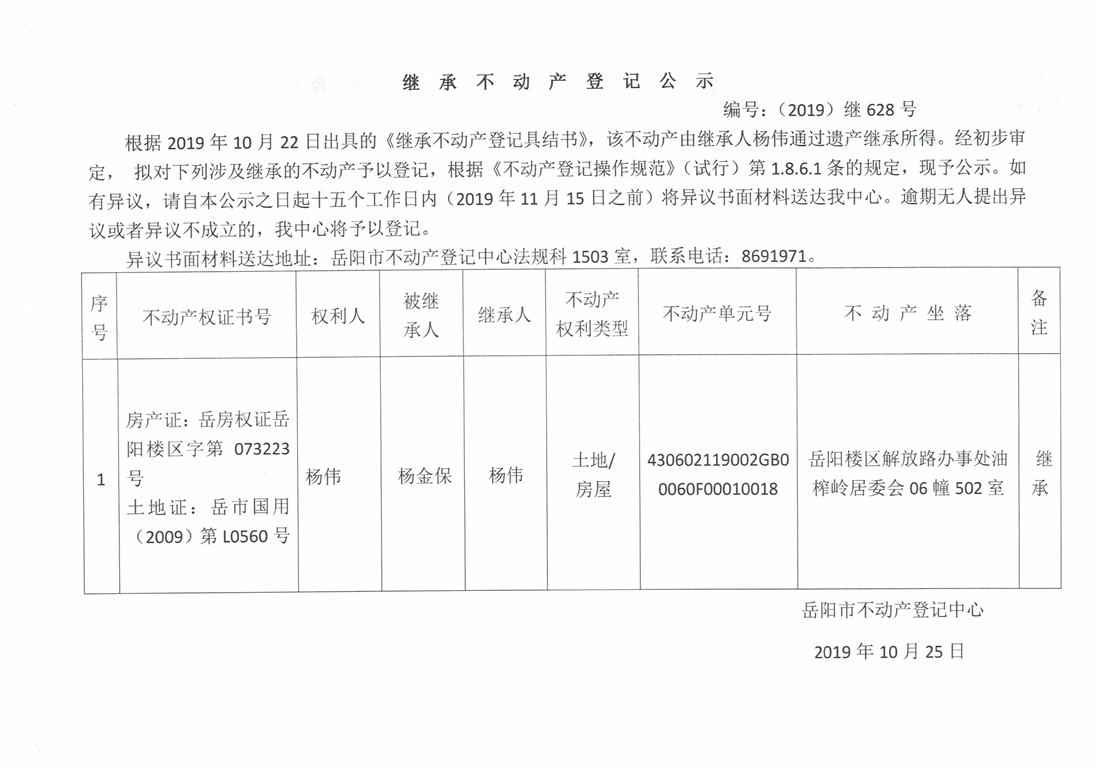 继承不动产登记公示 编号:(2019)继628号(杨伟)