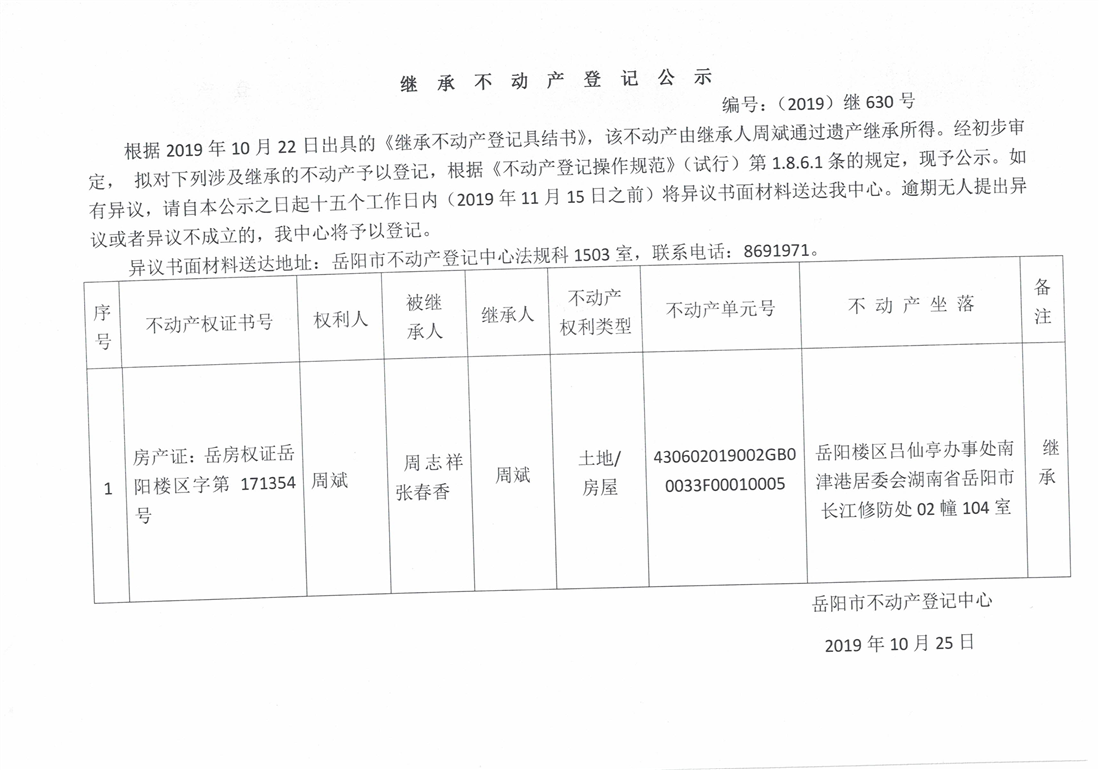 继承不动产登记公示 编号:(2019)继630号(周斌)