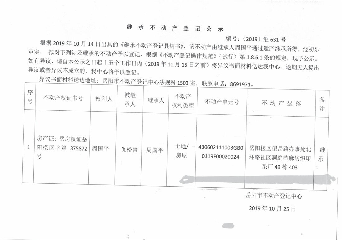 继承不动产登记公示 编号:(2019)继631号(周国平)