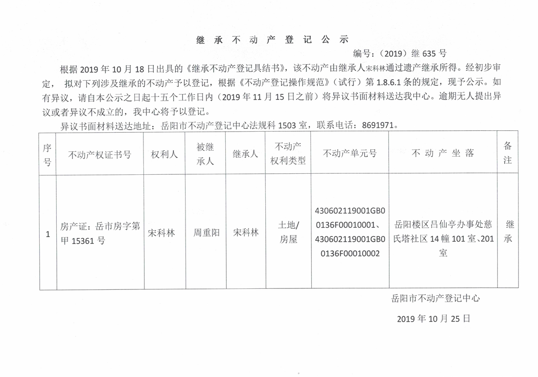 继承不动产登记公示 编号:(2019)继635号(宋科林)