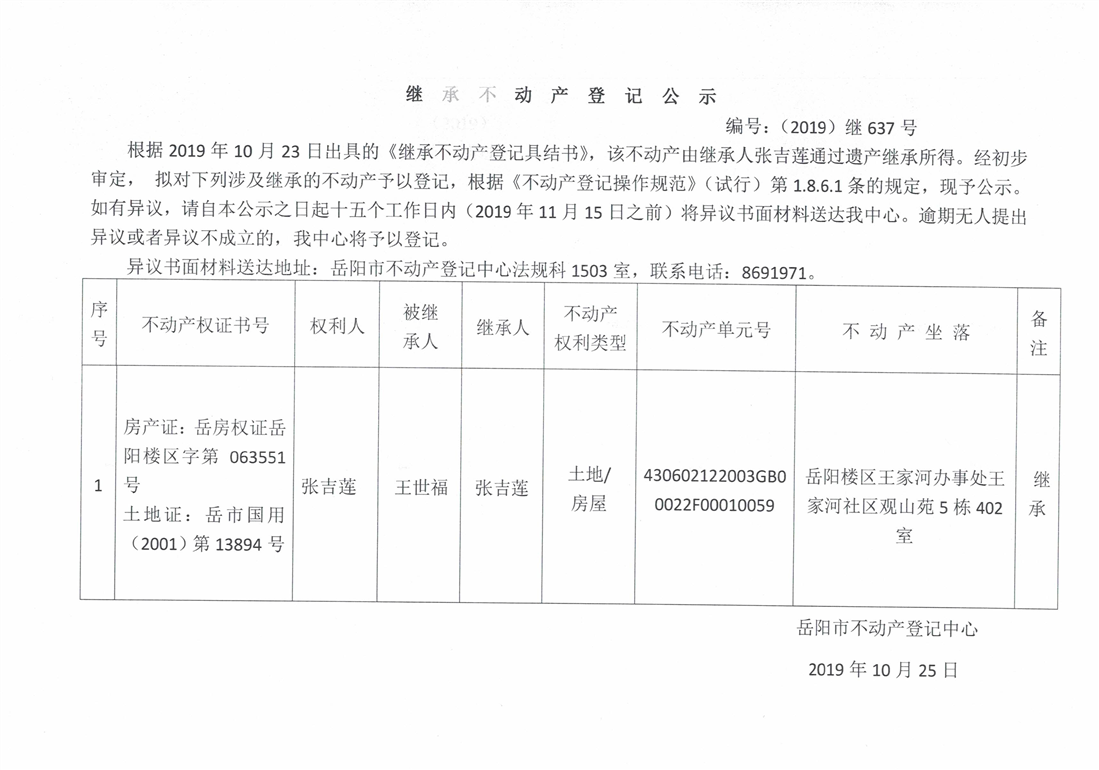 继承不动产登记公示 编号:(2019)继637号(张吉莲)
