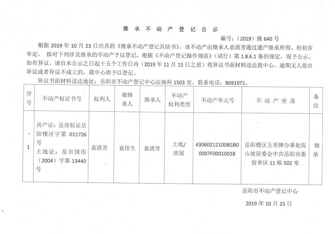 继承不动产登记公示 编号:(2019)继640号(袁清芳)