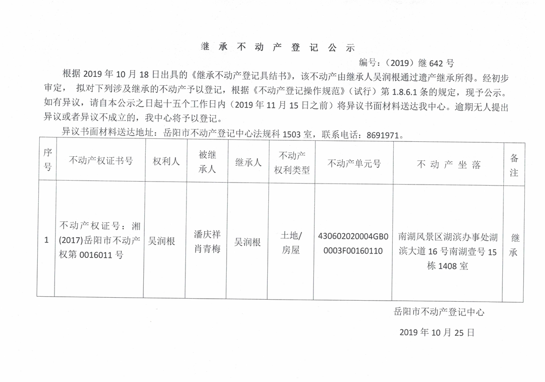 继承不动产登记公示 编号:(2019)继642号(吴润根)