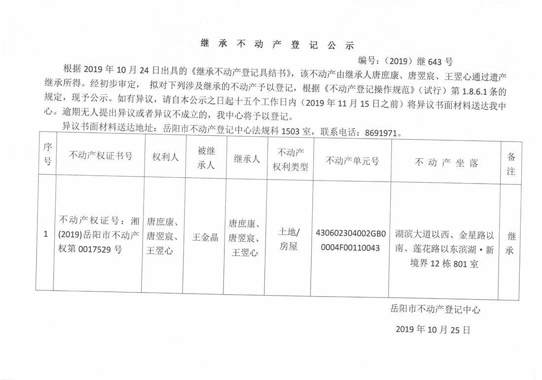 继承不动产登记公示 编号:(2019)继643号(唐庶康)