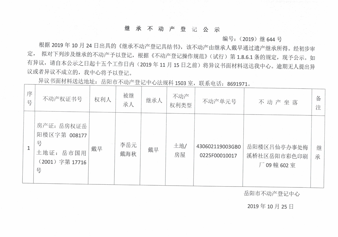 继承不动产登记公示 编号:(2019)继644号(戴早)