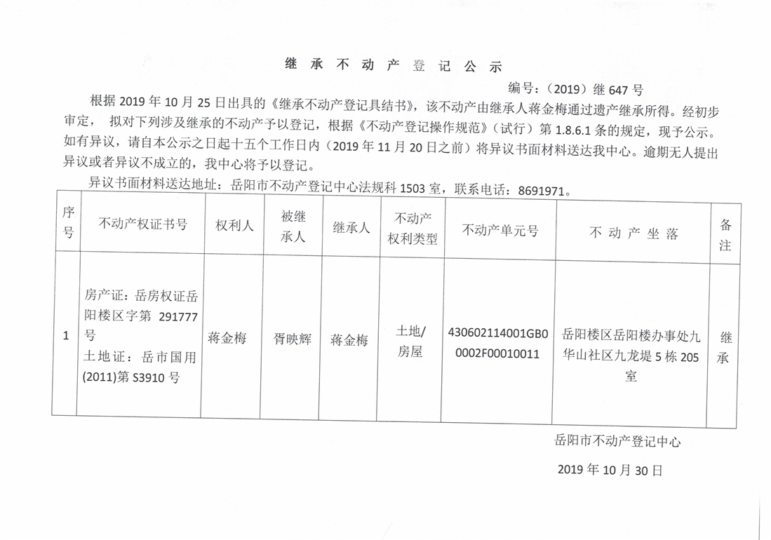 继承不动产登记公示 编号:(2019)继647号(蒋金梅)