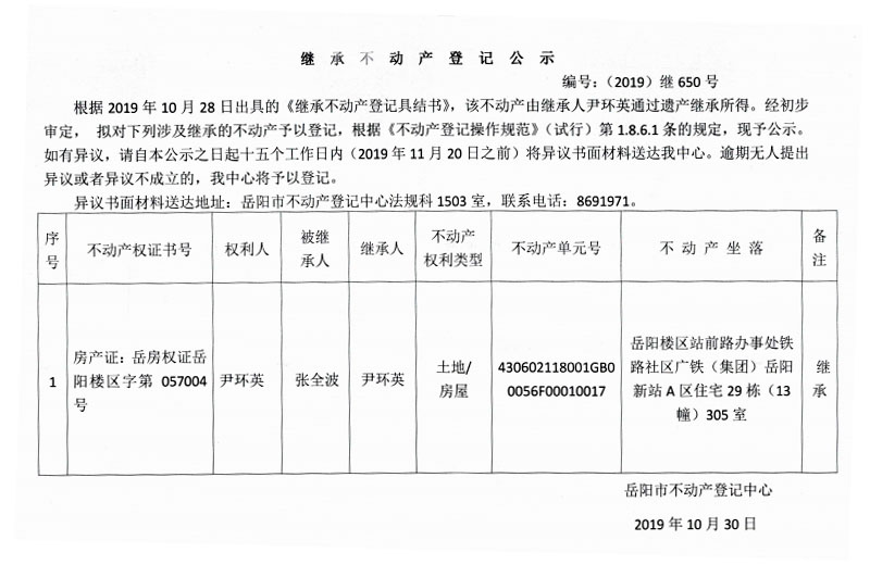 继承不动产登记公示 编号:(2019)继650号(尹环英)