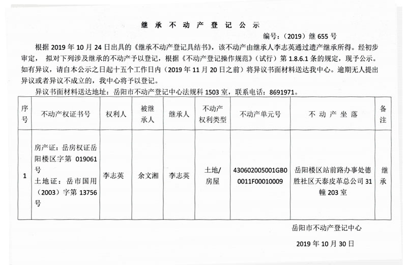 继承不动产登记公示 编号:(2019)继655号(李志英)
