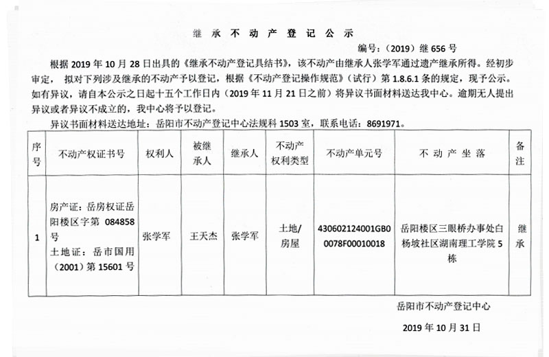 继承不动产登记公示 编号:(2019)继656号(张学军)