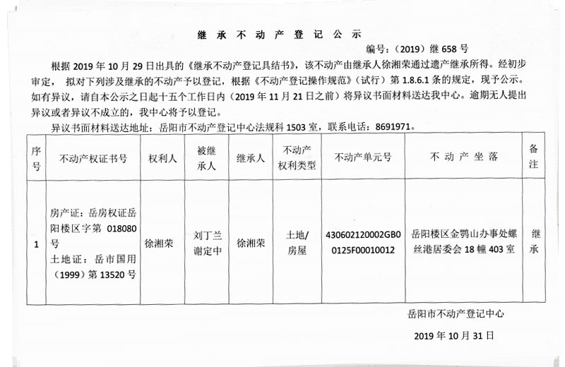 继承不动产登记公示 编号:(2019)继658号(徐湘荣)