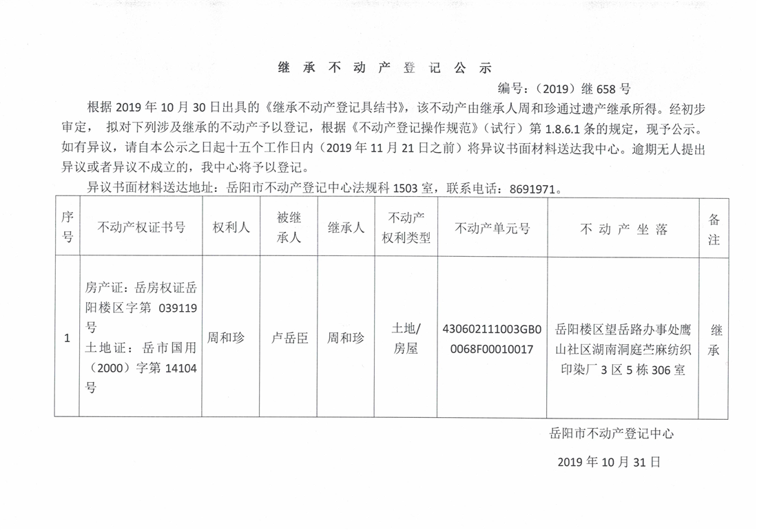 继承不动产登记公示 编号:(2019)继658号(周和珍)