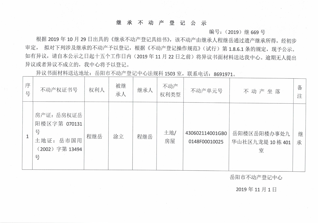 继承不动产登记公示 编号:(2019)继669号(程继岳)