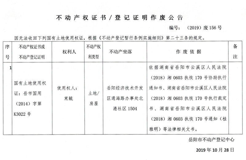 不动产权证书、登记证明作废公告 编号:(2019)废156号(束毓,国有土地使用权证:岳市国用(2014)字第K3022号)