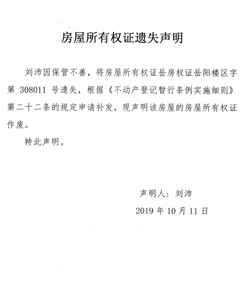 房屋所有权证遗失声明(刘沛,房屋所有权证岳房权证岳阳楼区字第308011号)