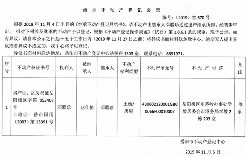 继承不动产登记公示 编号:(2019)继670号(邓腊珍,房产证053407)