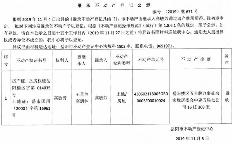 继承不动产登记公示 编号:(2019)继671号(高敏芳,房产证014035)