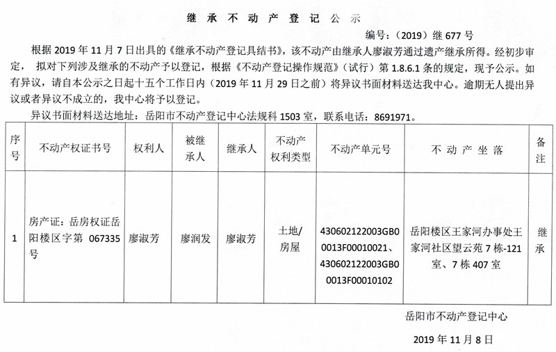 继承不动产登记公示 编号:(2019)继677号(廖淑芳,房产证067335)