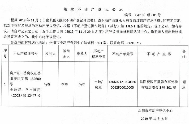 继承不动产登记公示 编号:(2019)继681号(冯春,房产证132600)