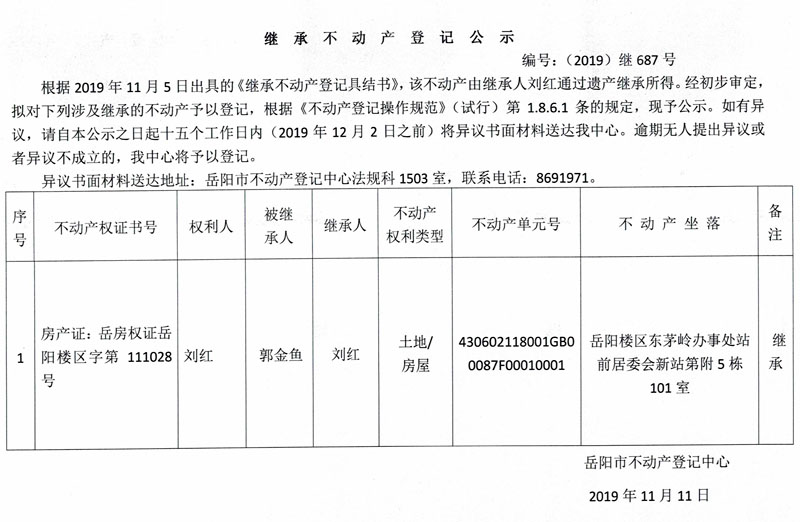 继承不动产登记公示 编号:(2019)继687号(刘红,房产证111028)