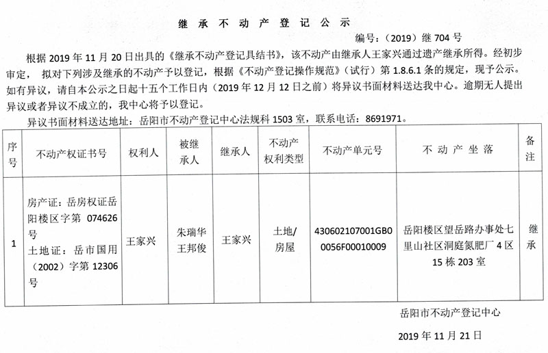 继承不动产登记公示 编号:(2019)继704号(王家兴)