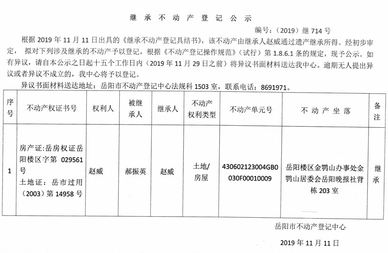 继承不动产登记公示 编号:(2019)继714号(赵威)