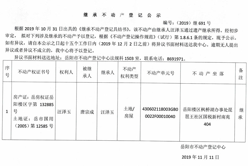 继承不动产登记公示 编号:(2019)继691号(汪泽玉)
