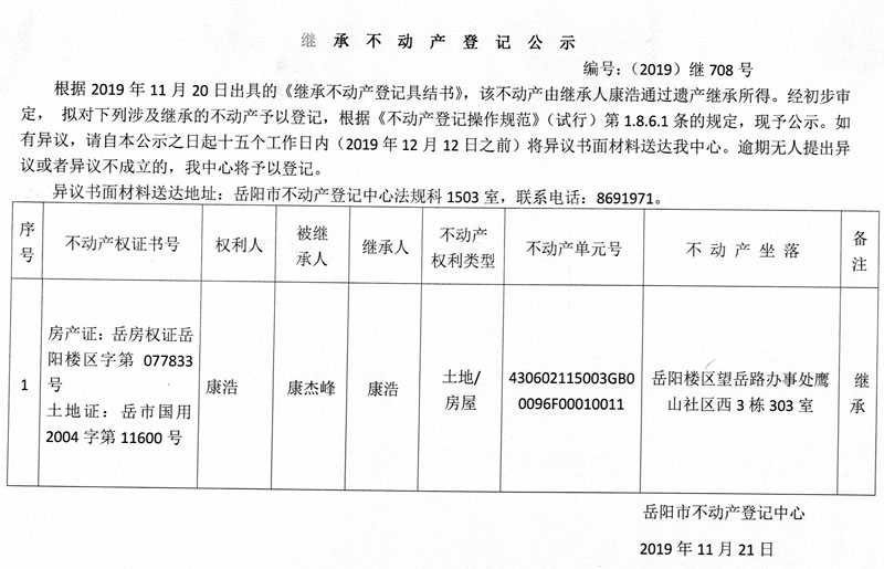 继承不动产登记公示 编号:(2019)继708号(康浩)