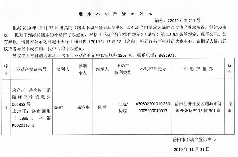 继承不动产登记公示 编号:(2019)继711号(陈胜)
