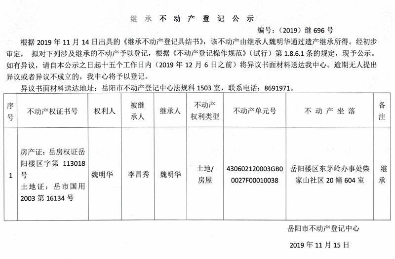 继承不动产登记公示 编号:(2019)继696号(魏明华)