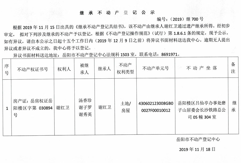 继承不动产登记公示 编号:(2019)继700号(谢红卫)
