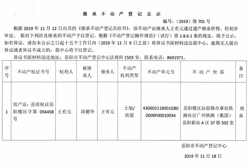继承不动产登记公示 编号:(2019)继701号(王有元)