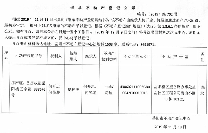 继承不动产登记公示 编号:(2019)继702号(何开忠、何昱璇)