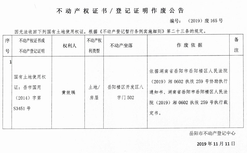 不动产权证书、登记证明作废公告 编号:(2019)废165号(黄效瑀,土地证岳市国用2014字第S3451号)
