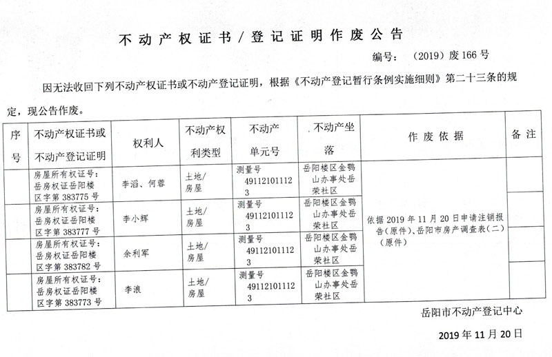 不动产权证书、登记证明作废公告 编号:(2019)废166号(李滔、何蓉、李小辉、余利军、李浪,房屋所有权证号岳房权证岳阳楼区字第383775、383777、383782、383773号)