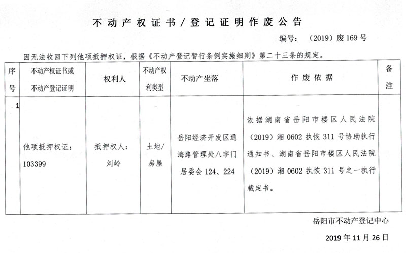 不动产权证书、登记证明作废公告 编号:(2019)废169号(抵押权人:刘岭,他项抵押权证:103399)