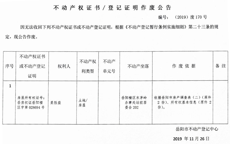 不动产权证书、登记证明作废公告 编号:(2019)废170号(姜胜益,房屋所有权证号岳房权证岳阳楼区字第028694号)