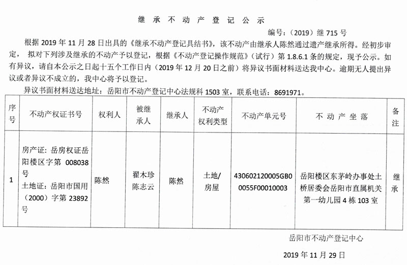 继承不动产登记公示 编号:(2019)继715号(陈然)