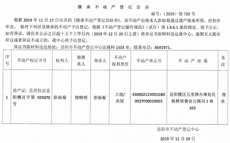 继承不动产登记公示 编号:(2019)继720号(彭灿菊)