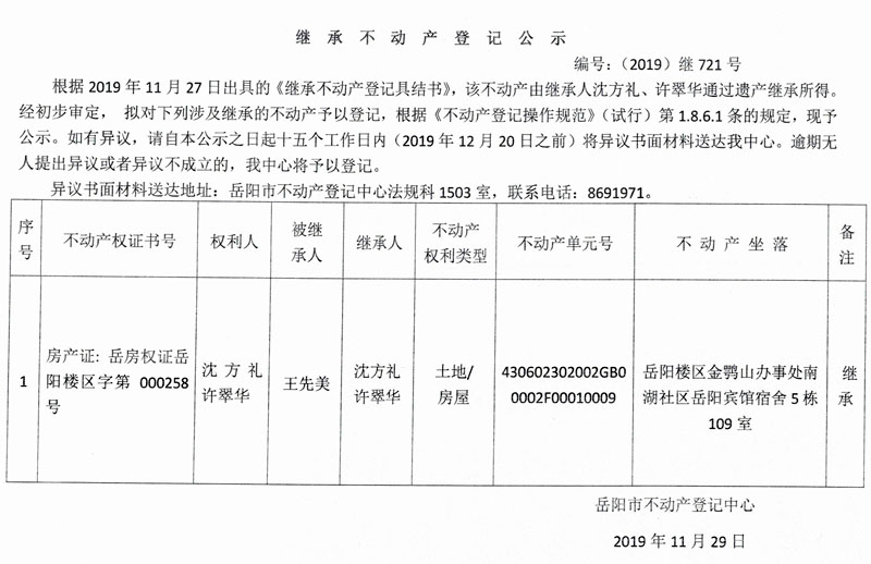 继承不动产登记公示 编号:(2019)继721号(沈方礼)