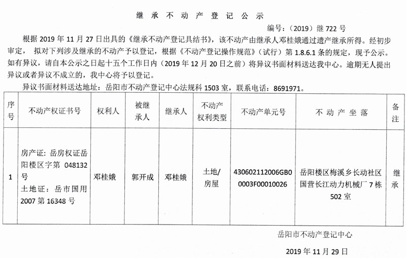 继承不动产登记公示 编号:(2019)继722号(邓桂娥)