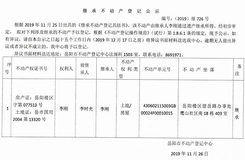继承不动产登记公示 编号:(2019)继726号(李刚)