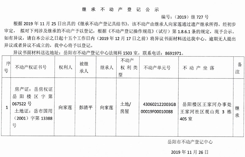 继承不动产登记公示 编号:(2019)继727号(向家莲)