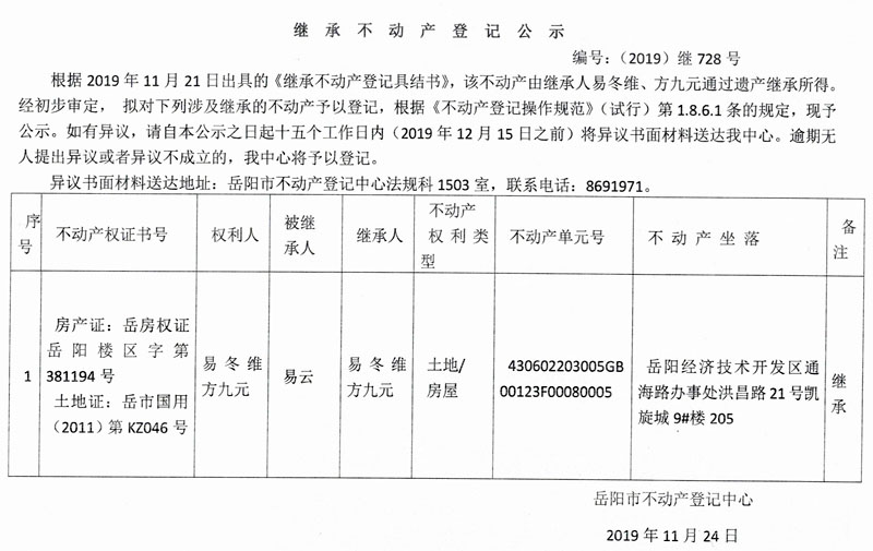 继承不动产登记公示 编号:(2019)继728号(易冬维)