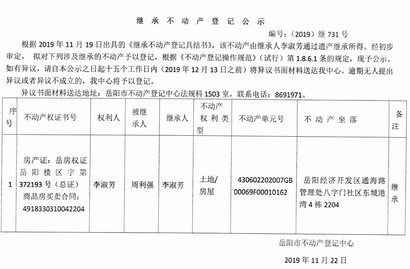 继承不动产登记公示 编号:(2019)继731号(李淑芳)