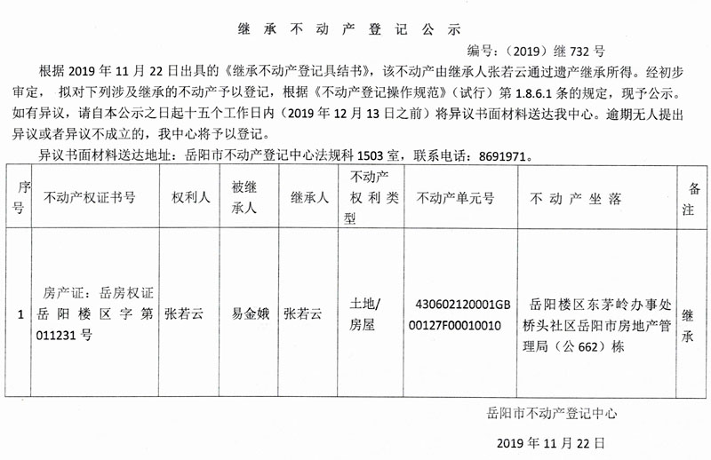 继承不动产登记公示 编号:(2019)继732号(张若云)