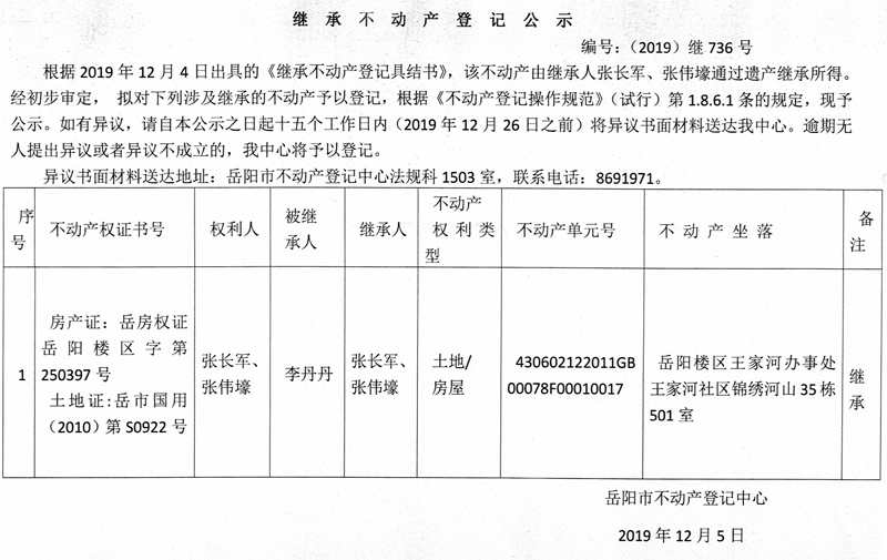继承不动产登记公示 编号:(2019)继736号(张长军)