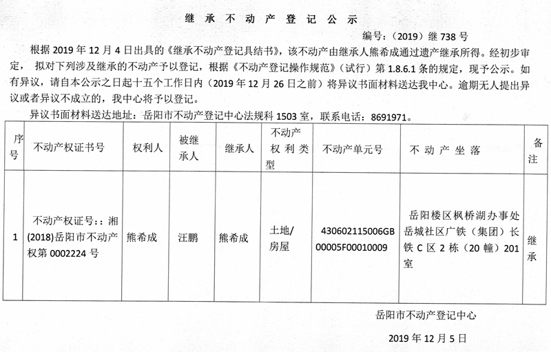 继承不动产登记公示 编号:(2019)继738号(熊希成)