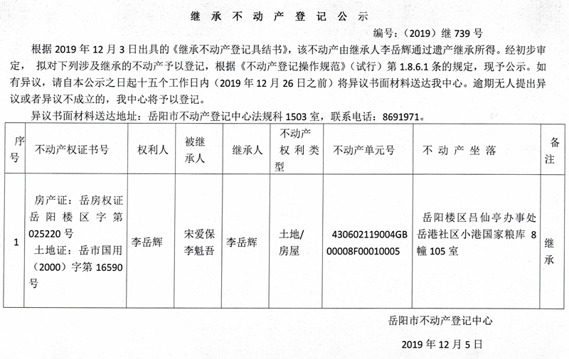 继承不动产登记公示 编号:(2019)继739号(李岳辉)