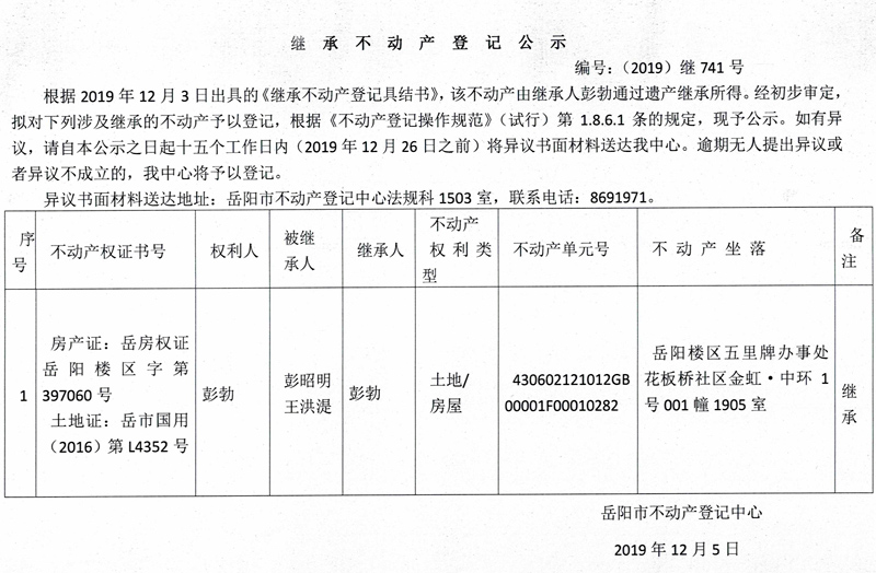 继承不动产登记公示 编号:(2019)继741号(彭勃)