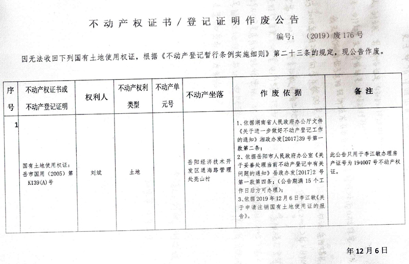 不动产权证书、登记证明作废公告 编号: (2019)废176号(刘斌,国有土地使用权证(2005)第K139(A)号)